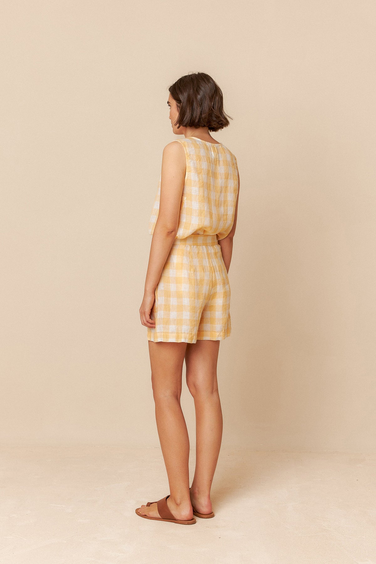 A retro style short. High waist with hidden side zipper closure, plus French cut pockets. Perfect to combine with the shirt from the same collection.