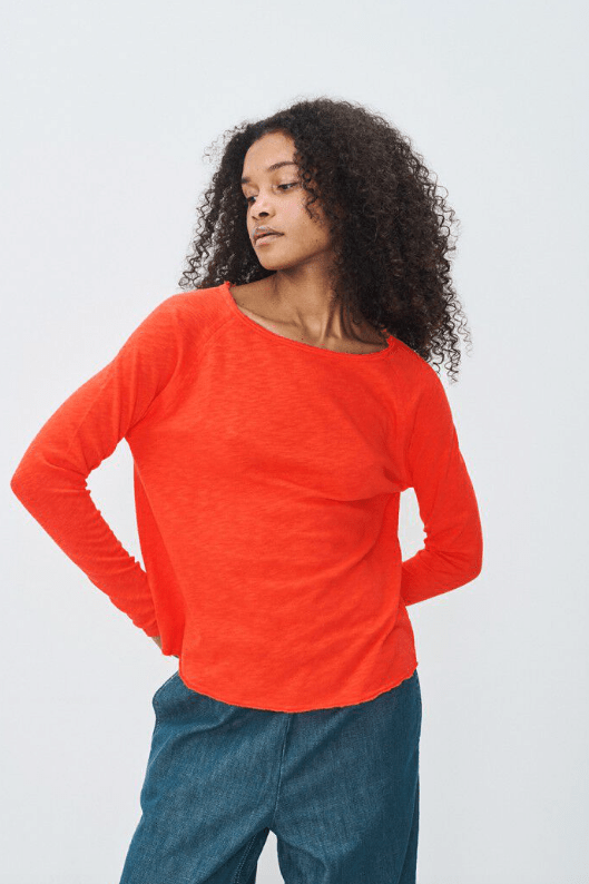 Featuring a rounded boat neckline, long sleeves and a boxy fit. Finished with rough organic cut edges on the hemline, neckline and sleeves.