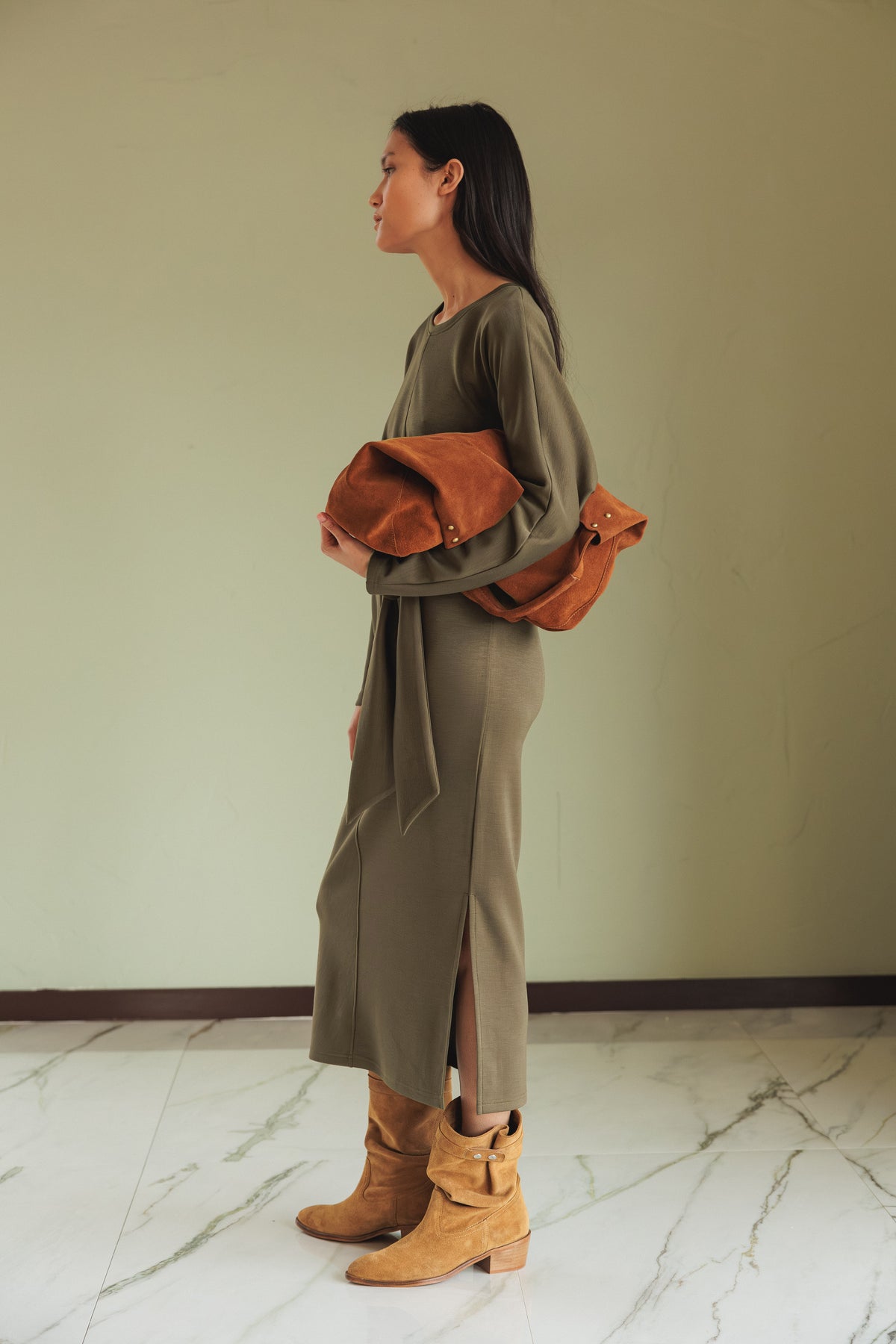 Knitted dress with a nice drape, fitted at the waist by adjusting the drawstring, plus a one side slit. The perfect combo of comfort and versatility.