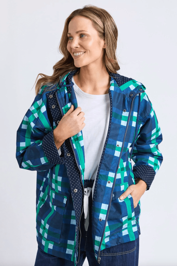 The Bari Raincoat featuring in Bari Print in the gorgeous checkered blue and green Hughs with the playful polka dot lining in the hood and through the front facing with buttons throughout the front and front pockets.