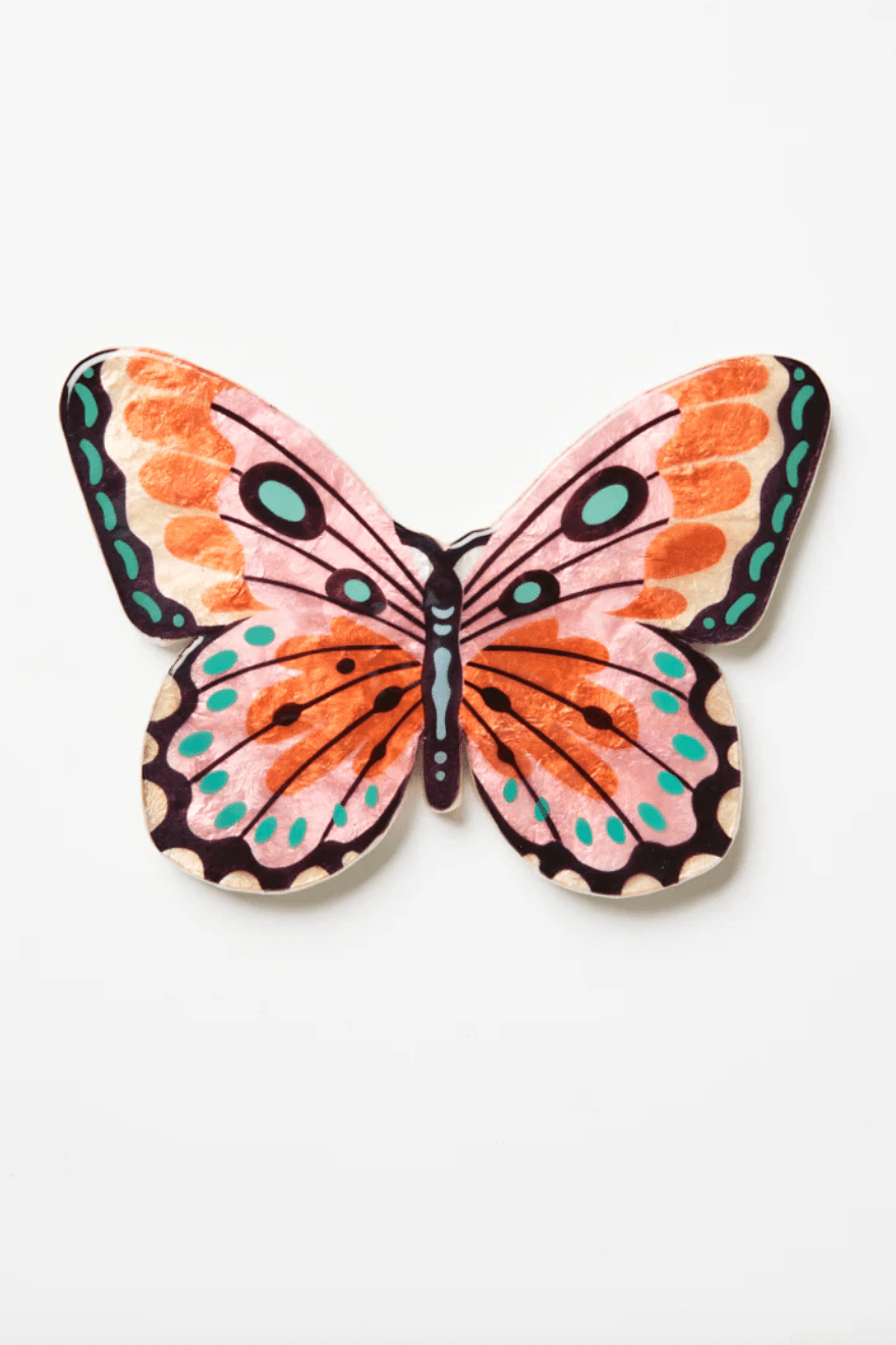 A little flutter of happiness. This pink butterfly wall art is hand-shaped from glossy capiz shell and painted in a garden-party palette of coral, blush and mint. Pop it on your wall for an instant hit of handmade joy. We love them teamed with our Folly Wall Vases.