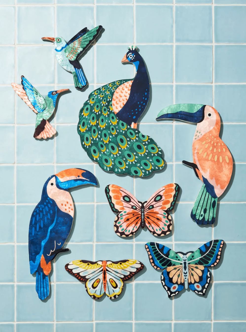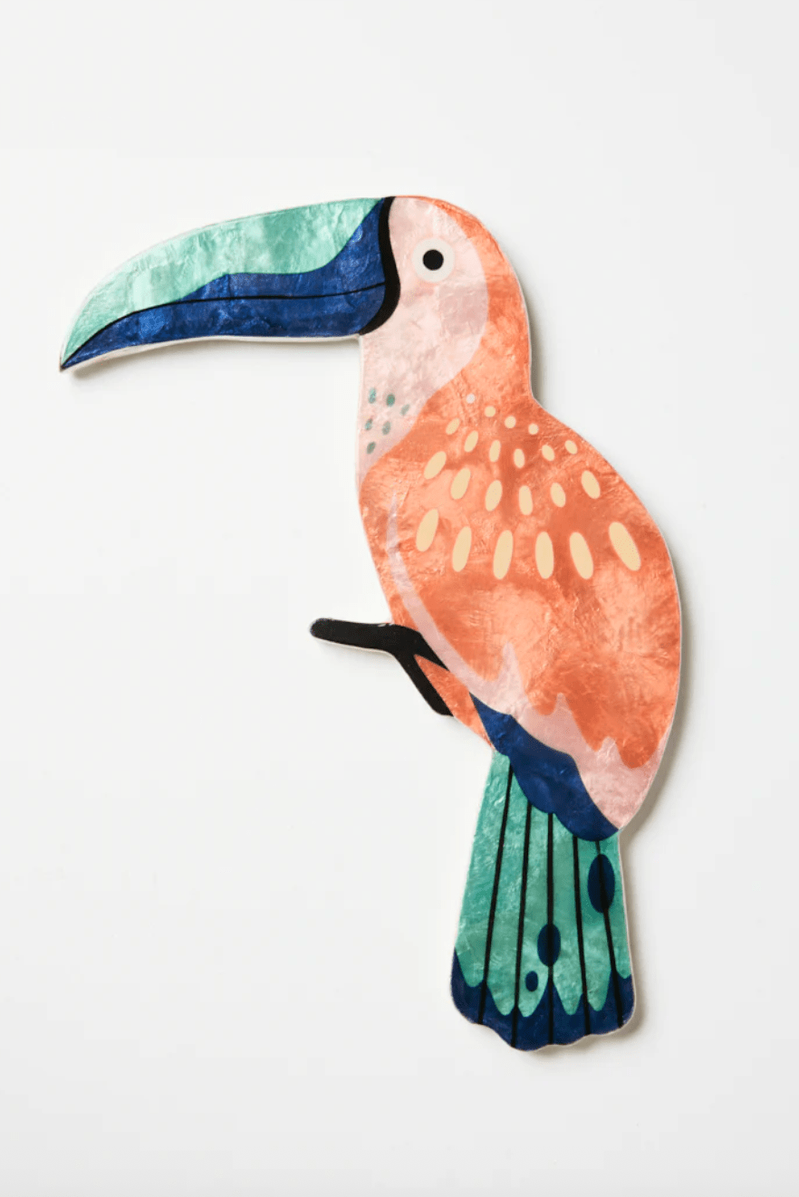 Meet the peachy version of our favourite jungle bird. This playful tropical toucan wall art is crafted from natural capiz shell and hand-painted in soft pastels with an inky green beak. Perfect on its own or paired with the navy toucan for a dynamic duo.