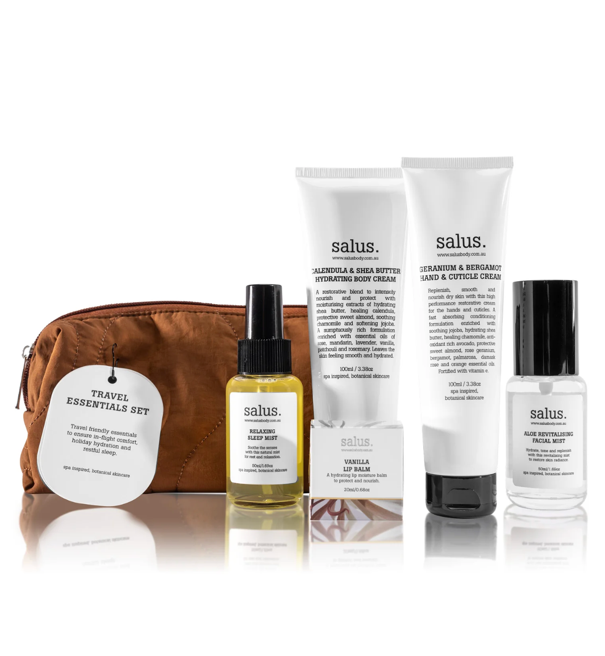 A re-imagined travel set featuring genuinely useful, travel-sized essentials designed to support in-flight comfort, holiday hydration, and restful sleep.