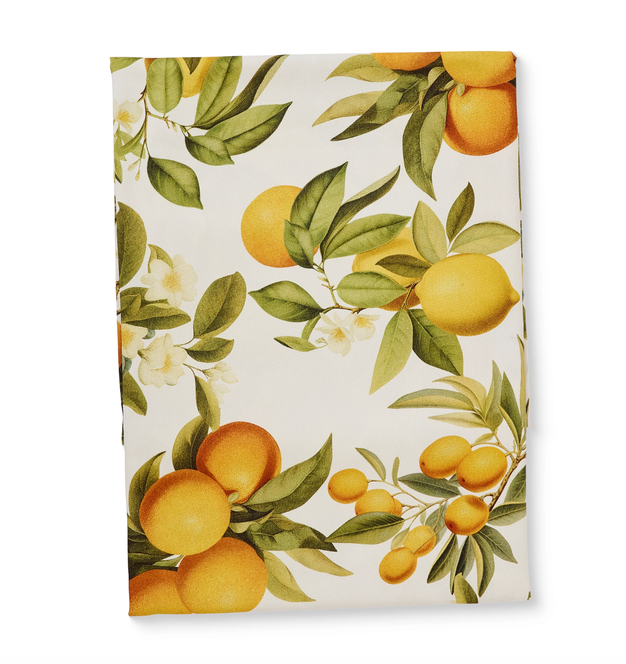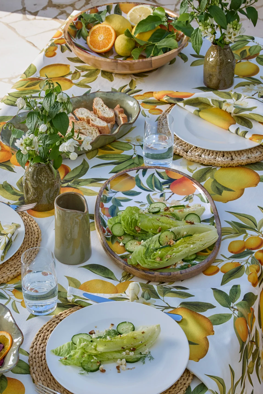 Infuse your dining area with the vibrant, sun-drenched charm of the Mediterranean with the Citrus Grove Tablecloth. This exquisite table linen features a lush botanical print of ripening lemons and oranges nestled among crisp green leaves and delicate white blossoms, creating an inviting atmosphere for any meal.