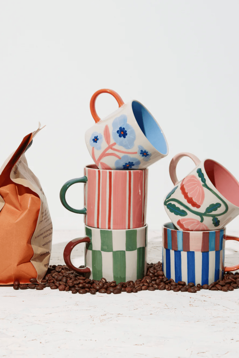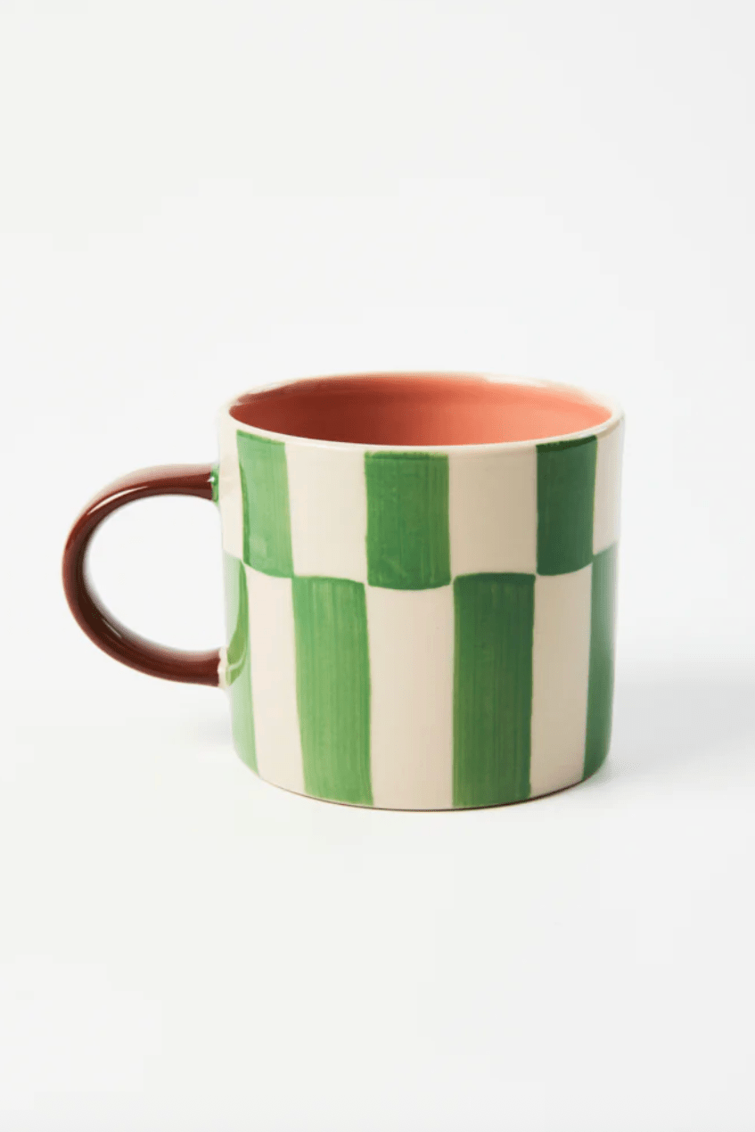 Bring some playful pattern to your coffee ritual. The Bloomie Green Check Mug is hand-painted in a graphic gingham style check, with a smooth pink glaze inside for contrast. It's the kind of mug that makes coffee breaks feel like a treat, fresh, functional, cool and beautifully crafted from earthenware.