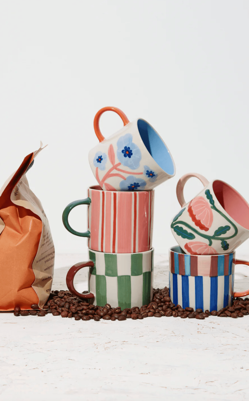 Stripes with soul. This pink striped mug combines hand-painted charm with soft, vintage tones and a generous, curved handle. Perfect for long mornings or slow sips, it's made from earthenware and designed to be mixed and matched with the rest of the Bloomie family.