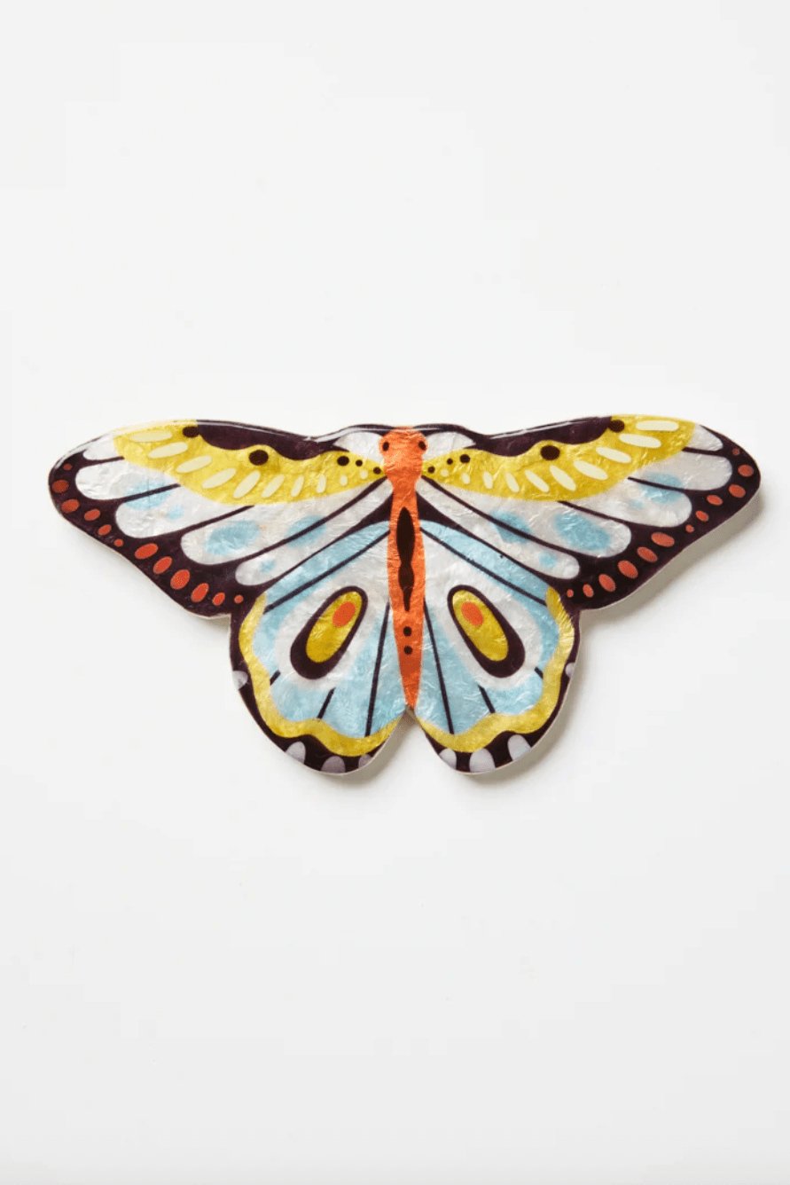 Like sunshine in butterfly form. With cheerful pops of yellow, coral and sky blue, this yellow butterfly wall decor is cut from glowing capiz shell and hand-painted to perfection. A bright idea for bedrooms, playrooms or anywhere that needs a lift. We love it paired with the other Canopy butterflies in a little grouping on the wall.