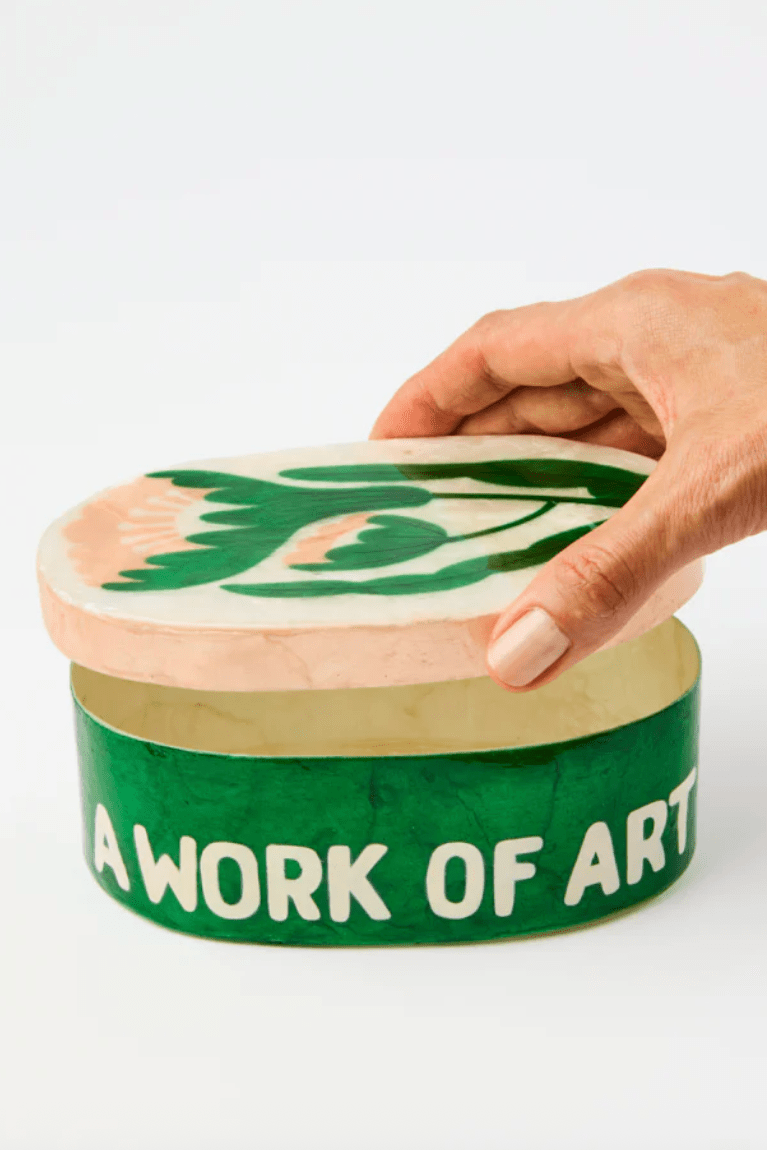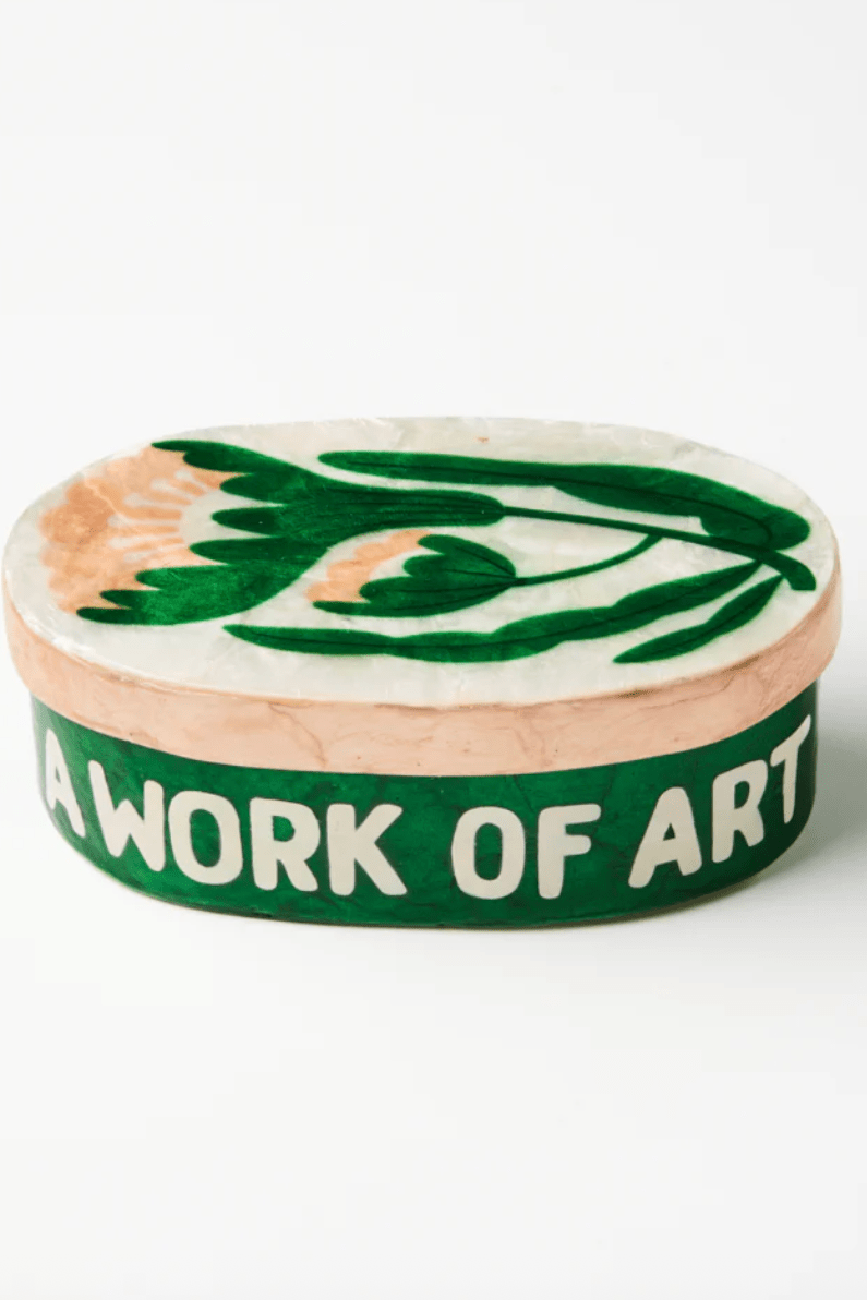A modern floral motif washes across this generously sized Capiz shell box, creating a luminous vessel for treasured objects. Designed in Sydney and meticulously crafted by skilled artisans in the Philippines, each piece celebrates the natural iridescence of the shell through thoughtful pattern and colour. So much so we inscribed "work of art" on the side. Perfect for storing jewellery and mementos.