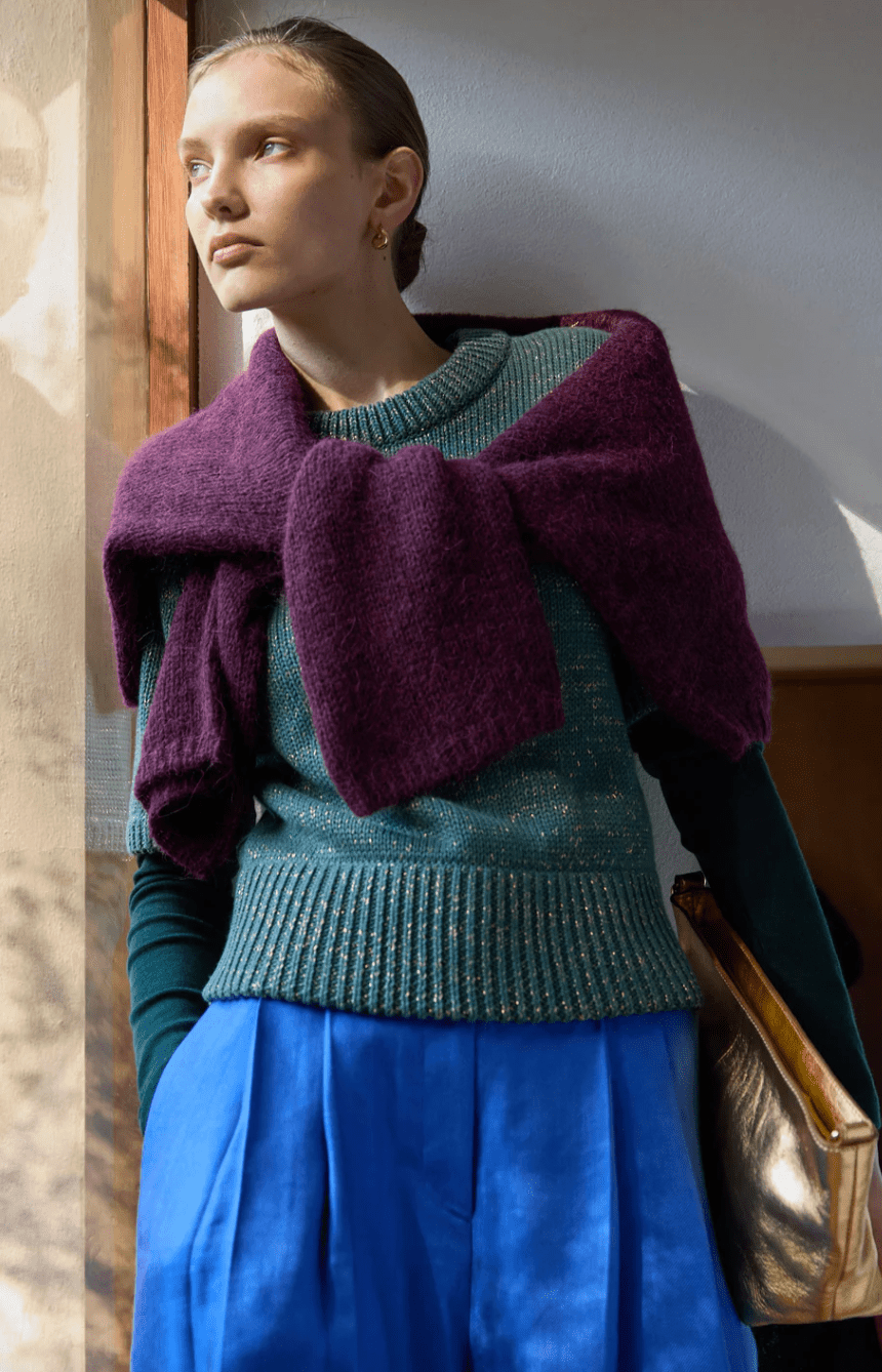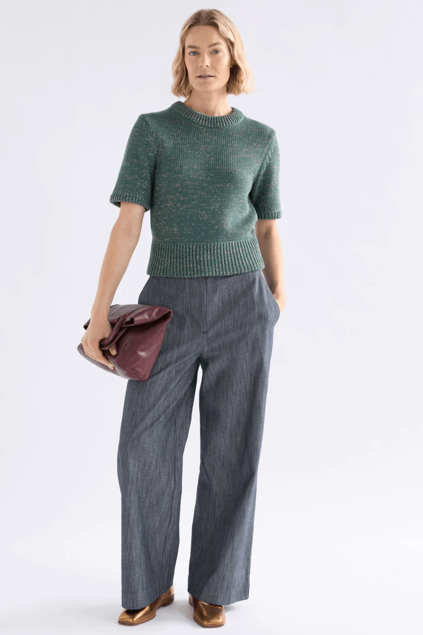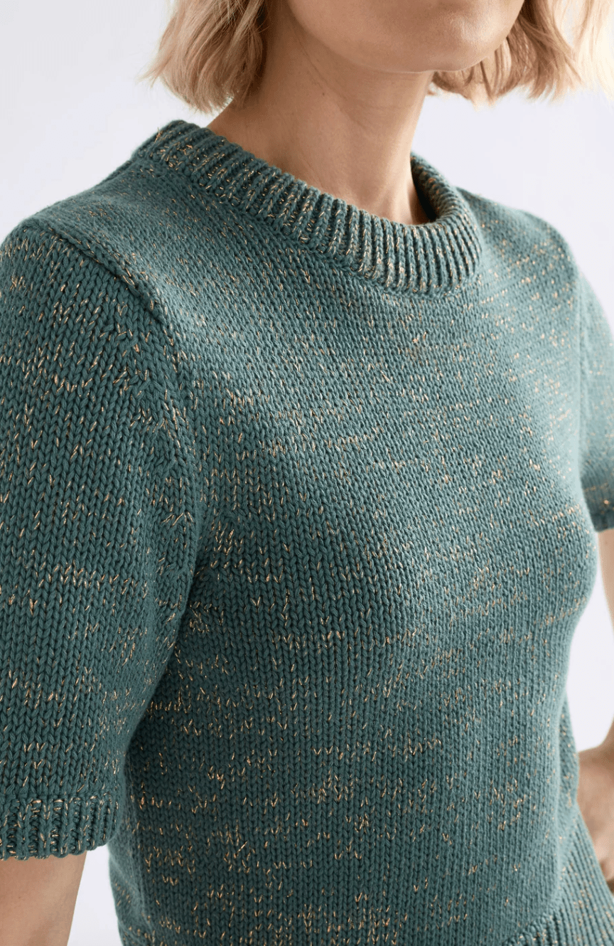 The Luft Lurex Knit Top is a chunky knitted top in a soft organic cotton yarn with a fine metallic thread woven throughout, creating a gentle shimmer. This close fit, short sleeve sweater features a slightly cropped body length and double rib finish at the hem, neck, and sleeves. Its classic shape makes it a timeless wardrobe staple and the perfect warm layer to take you from every day and into the evenings, pair with high-waisted trousers, like our printed Paimo Light Pant for a playful, elevated look.
