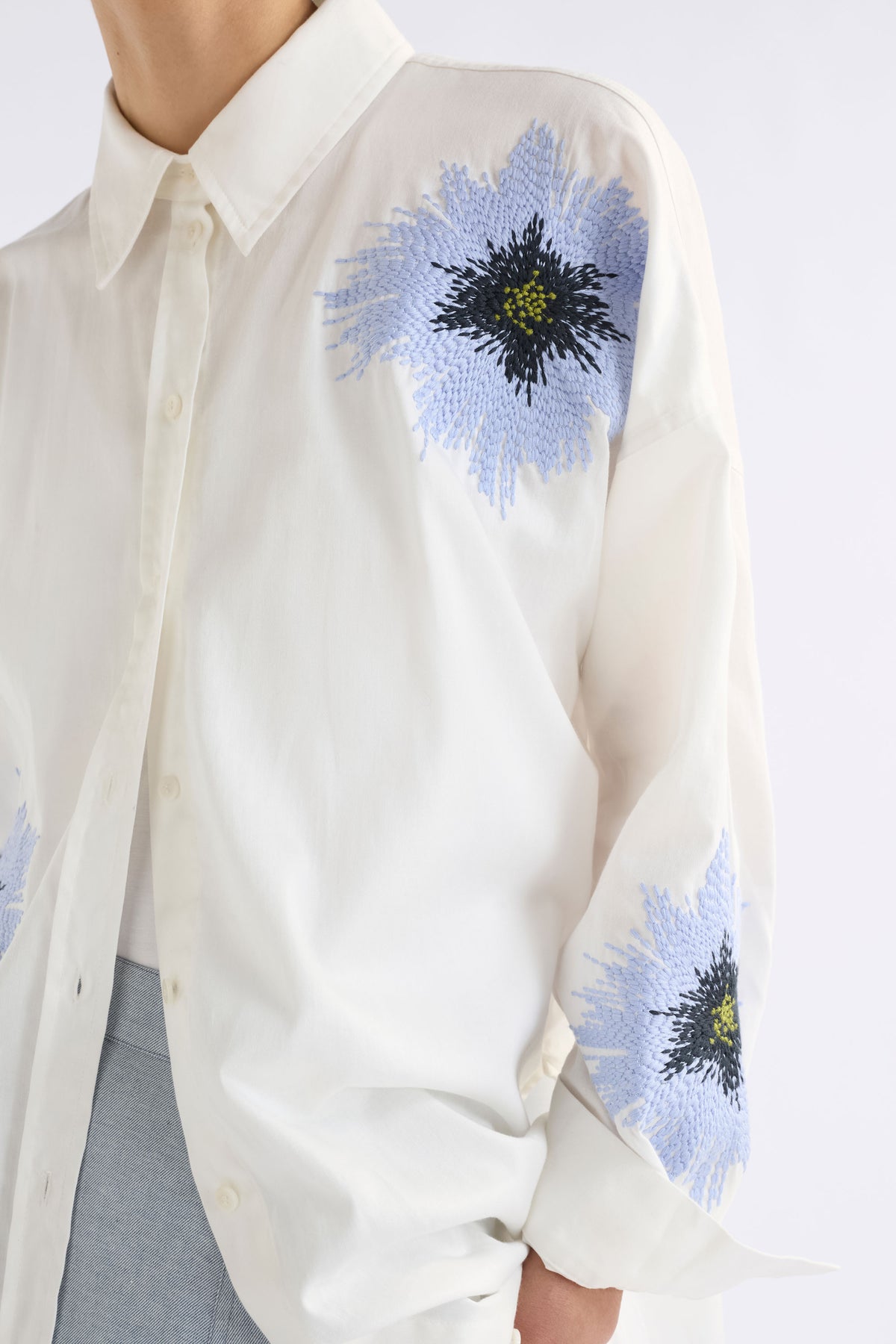 The Eiren Relaxed Shirt is a long sleeve style crafted from an organic cotton sateen featuring bold and textural, floral embroidery motifs. With a classic shirt collar, button-through placket, and dropped shoulders, this regular fit long sleeve shirt is finished with an inverted box pleat at the back. The curved hem with side splits create a modern silhouette that makes it easy to wear tucked in or out. Layer open over fitted tops or wear buttoned up with tailored trousers for everyday looks that transition from casual to more polished.
